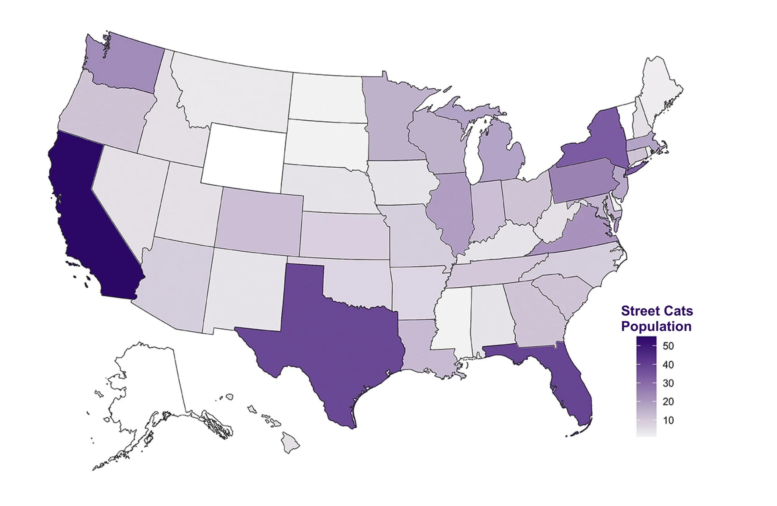 With the populous states of California, Florida, Texas, and New York drawing commensurately high levels of participation of street cats.