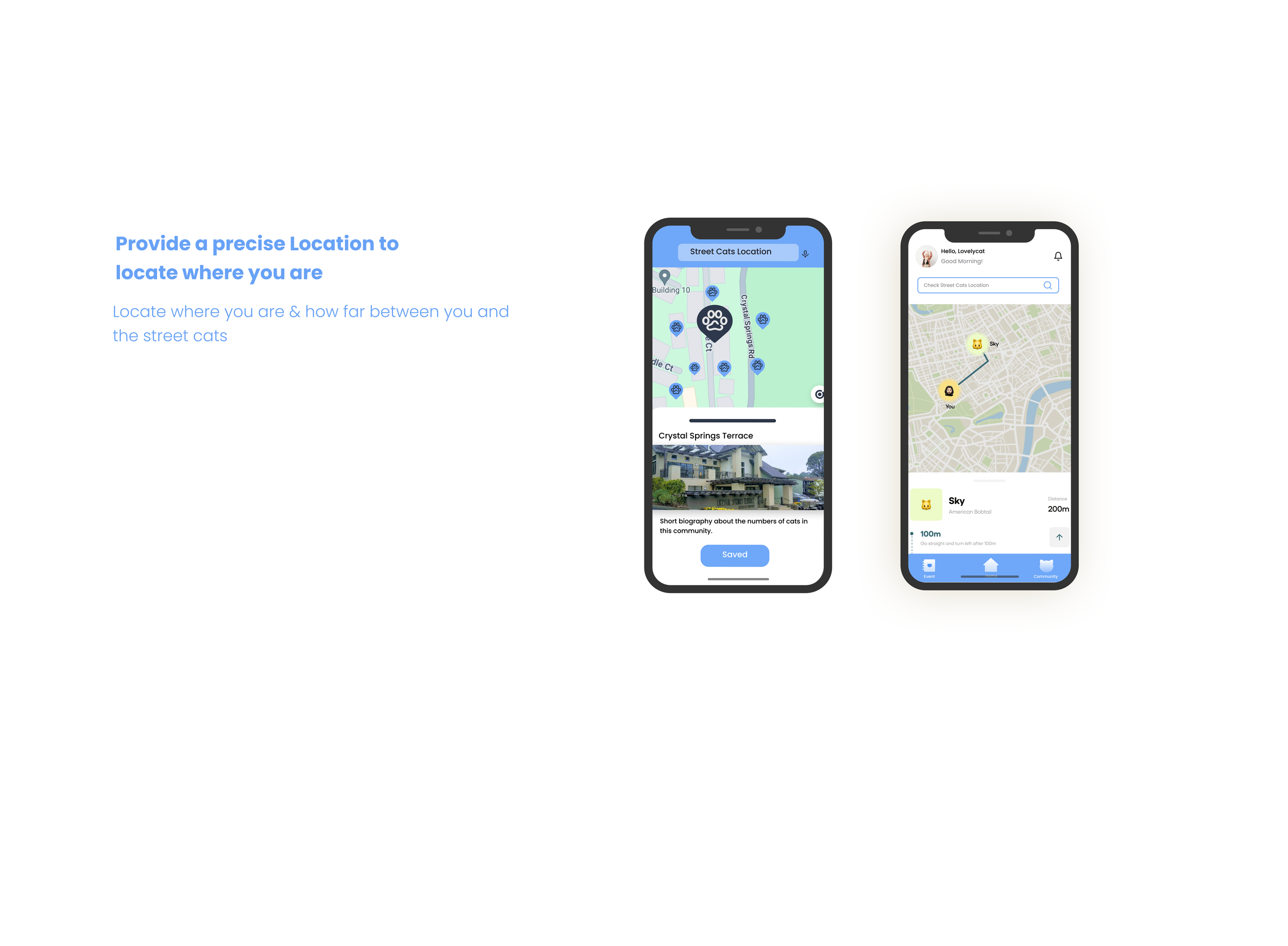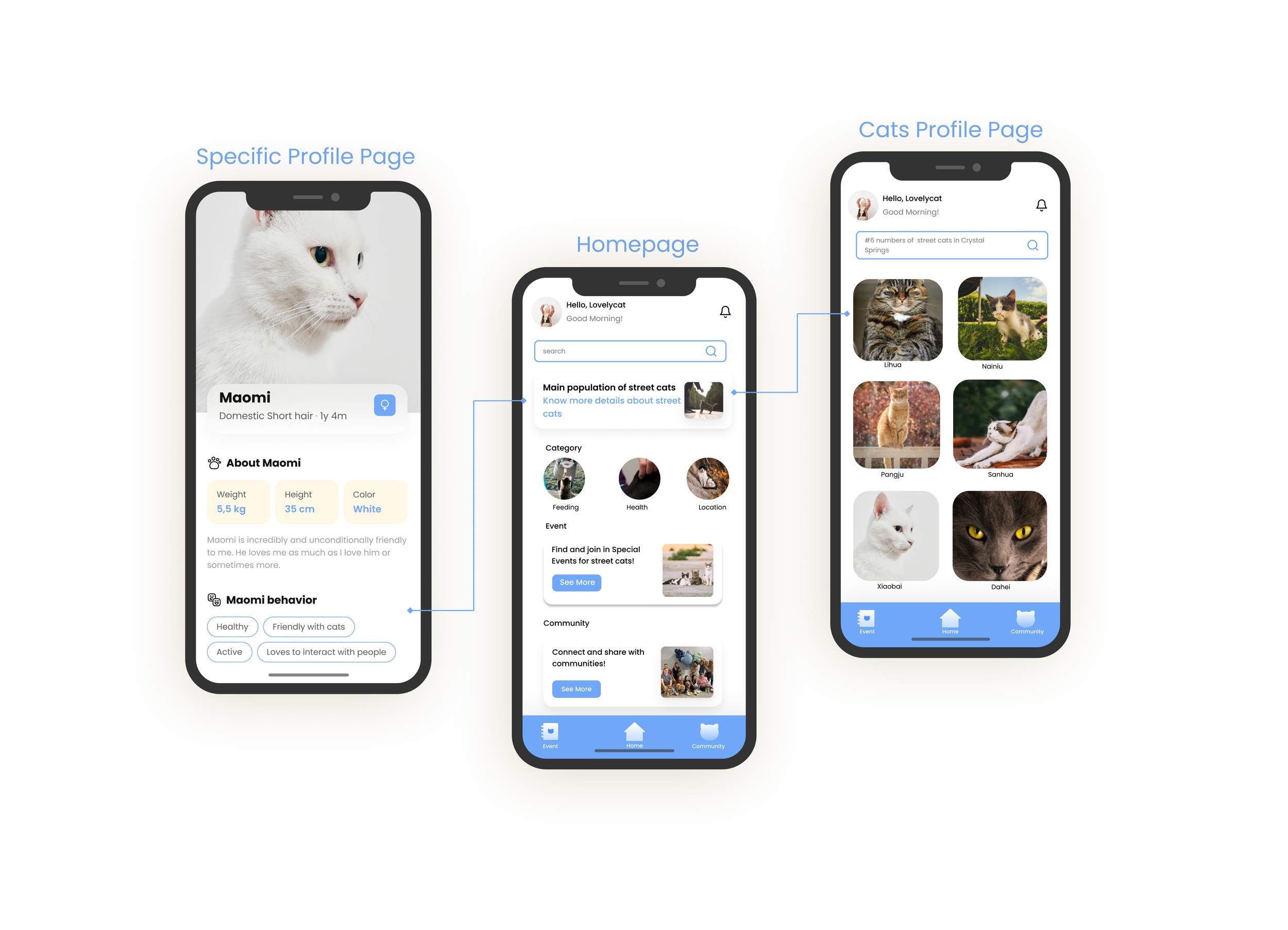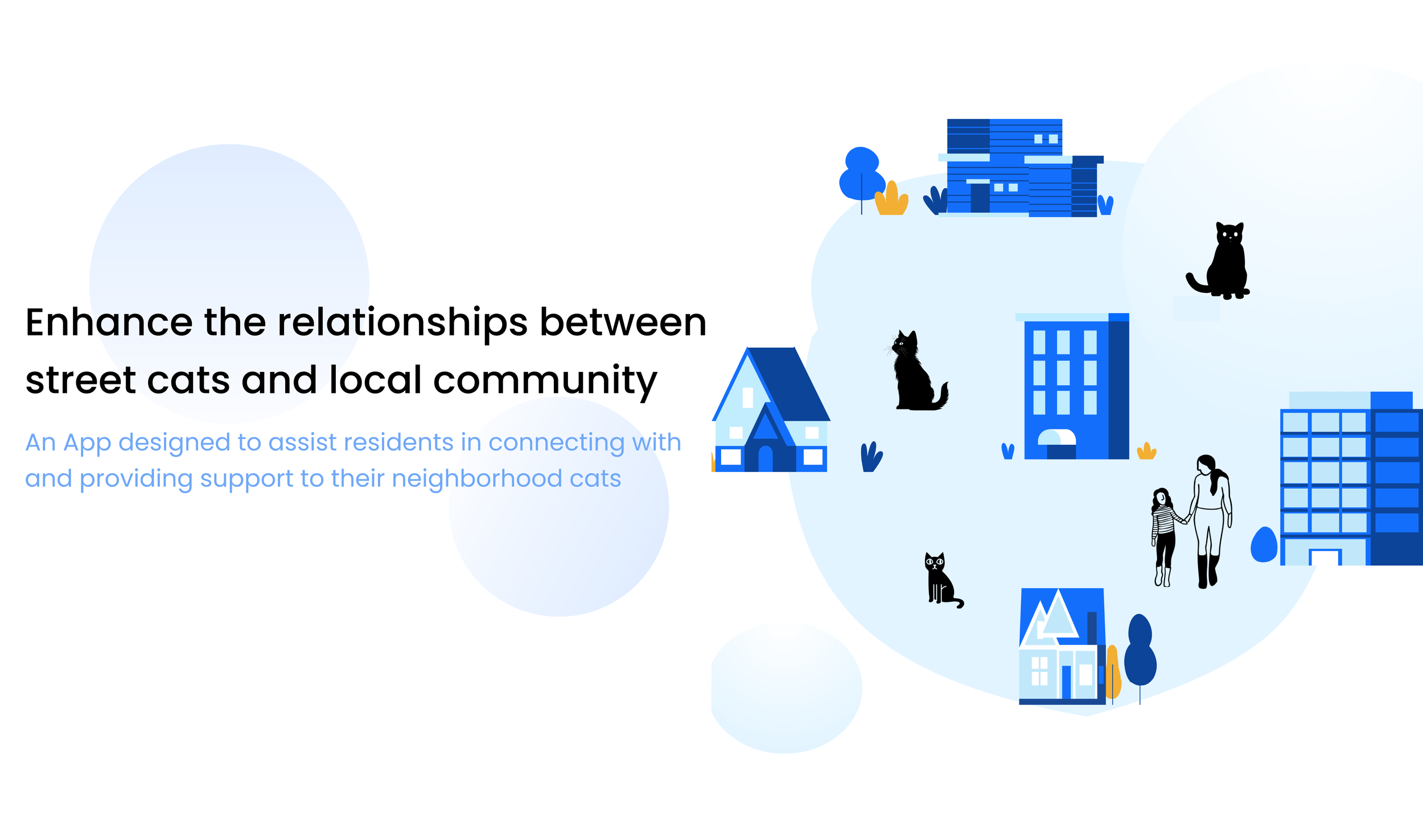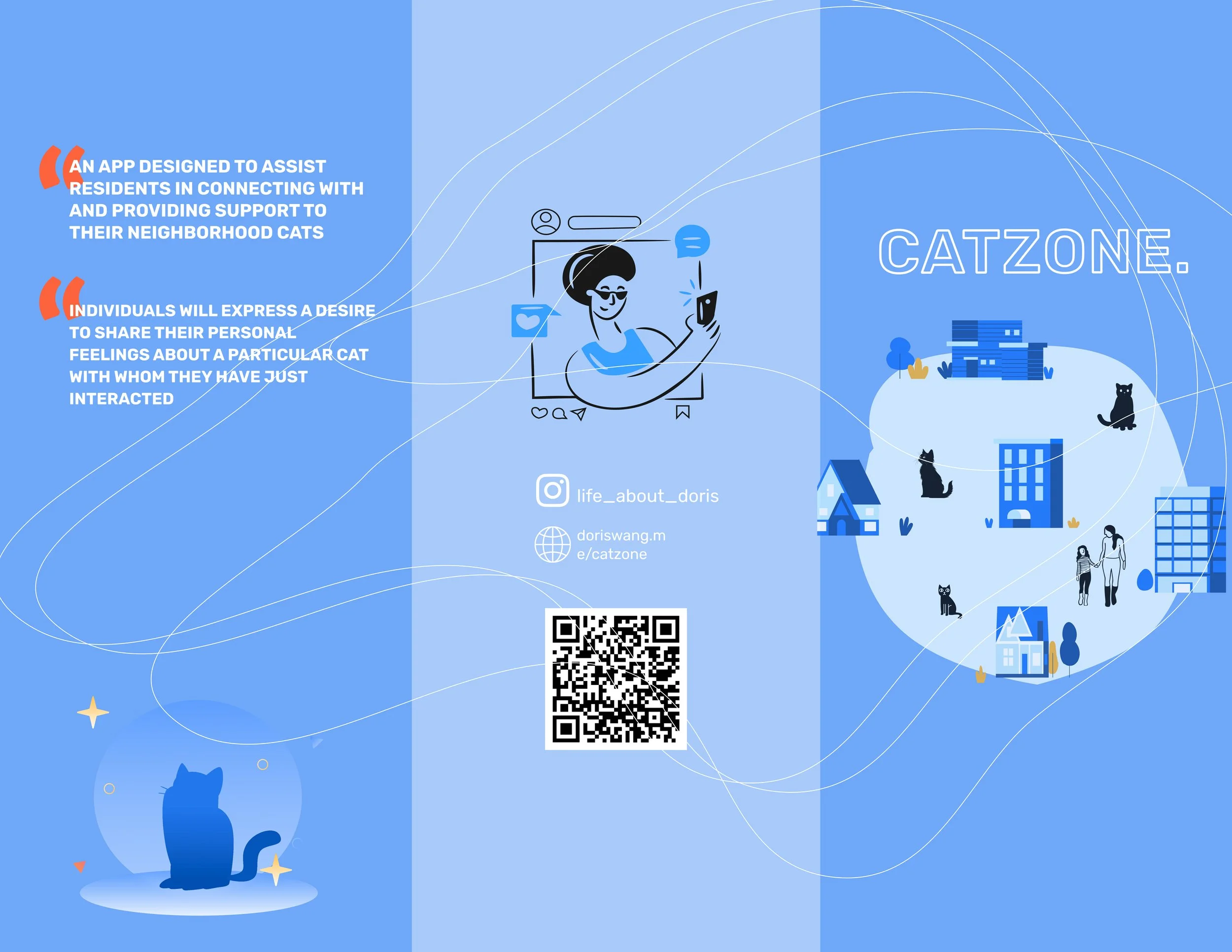 For my thesis project, which took place in the spring of 2024 at the California College of the Arts, I used design solutions to develop an app which would help people know more about the street cats in their community and collectively take care of them. The installation includes: