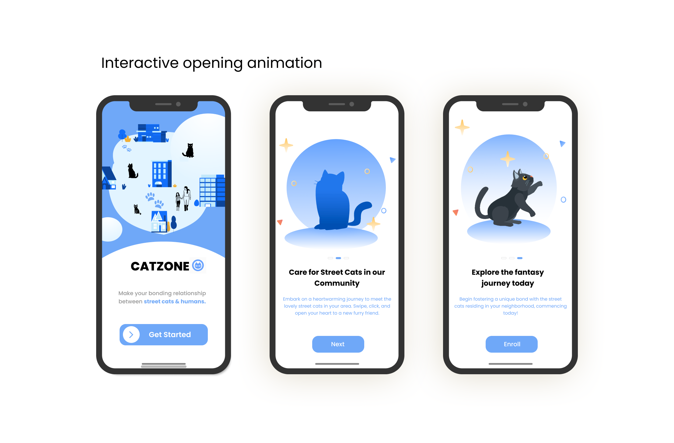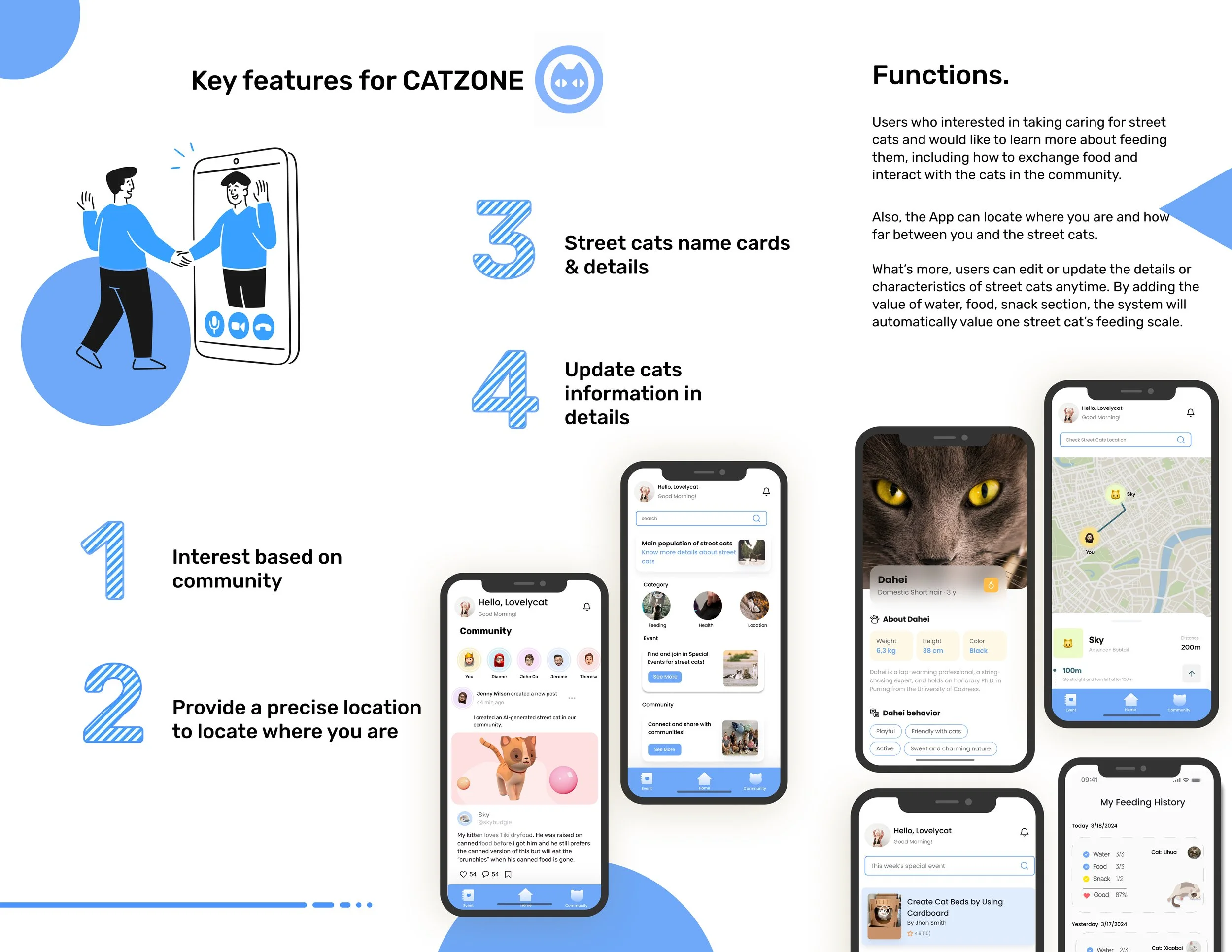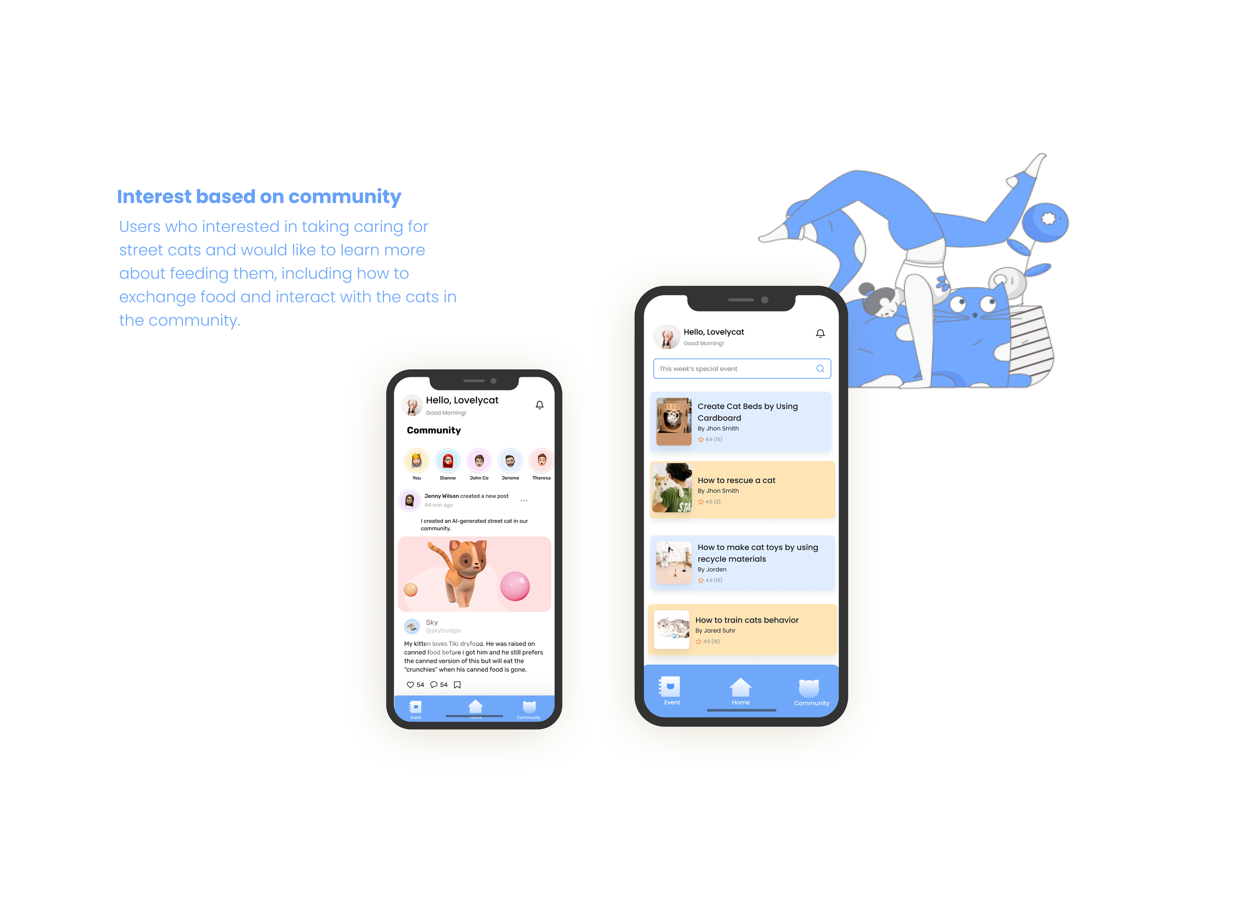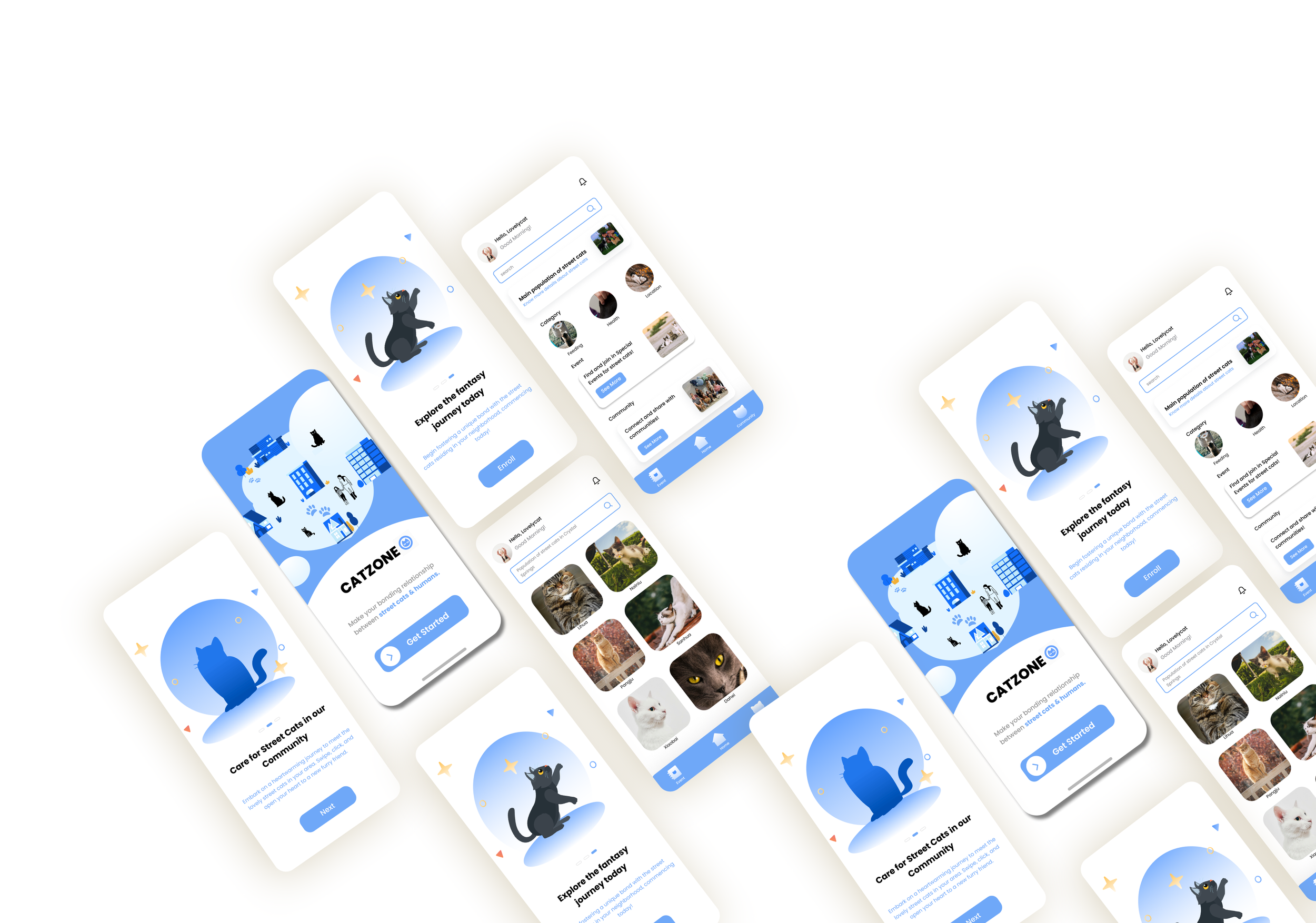 For my thesis project, which took place in the spring of 2024 at the California College of the Arts, I used design solutions to develop an app which would help people know more about the street cats in their community and collectively take care of them. The installation includes:
